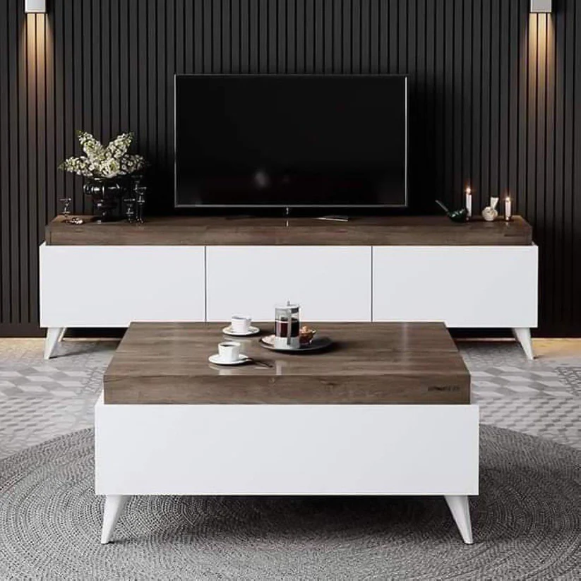 This complete set combines an elegant TV stand with a practical coffee table, with a harmonious design that adds a touch of sophistication to your home. It provides organized space for your TV and devices, with a surface suitable for arranging decorations or drinks. It’s an ideal choice that combines beauty and utility to elegantly complement your home décor.