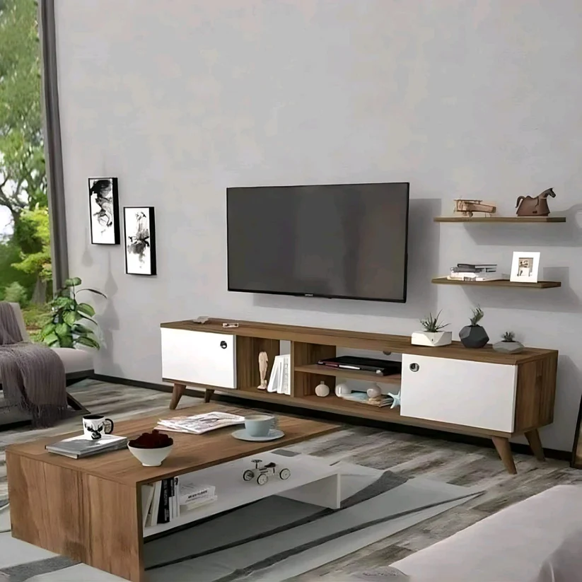 This complete set combines an elegant TV stand with a practical coffee table, with a harmonious design that adds a touch of sophistication to your home. It provides organized space for your TV and devices, with a surface suitable for arranging decorations or drinks. It’s an ideal choice that combines beauty and utility to elegantly complement your home décor.